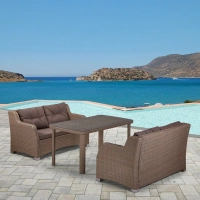 _x000D_ Обеденная группа с диванами и большим столом в светлом ротанге. Диваны и стол не имеют острых углов, благодаря чему дизайн выглядит интересным и необычным. Искусственный ротанг — неприхотлив в использовании, устойчив к перепадам температуры и ультрафиолетовому излучению. Это прочный и надежный в эксплуатации материал.