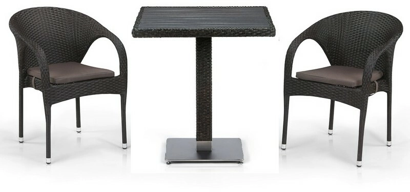 Стол: L70x70xH74 см. Столешница: древесно-полимерный композит. Кресло: W59xD63xH81 см. Каркас: сталь. Материал: искусственный ротанг. Цвет: Brown. Объем и вес комплекта: 0,76 куб. м, 54кг.