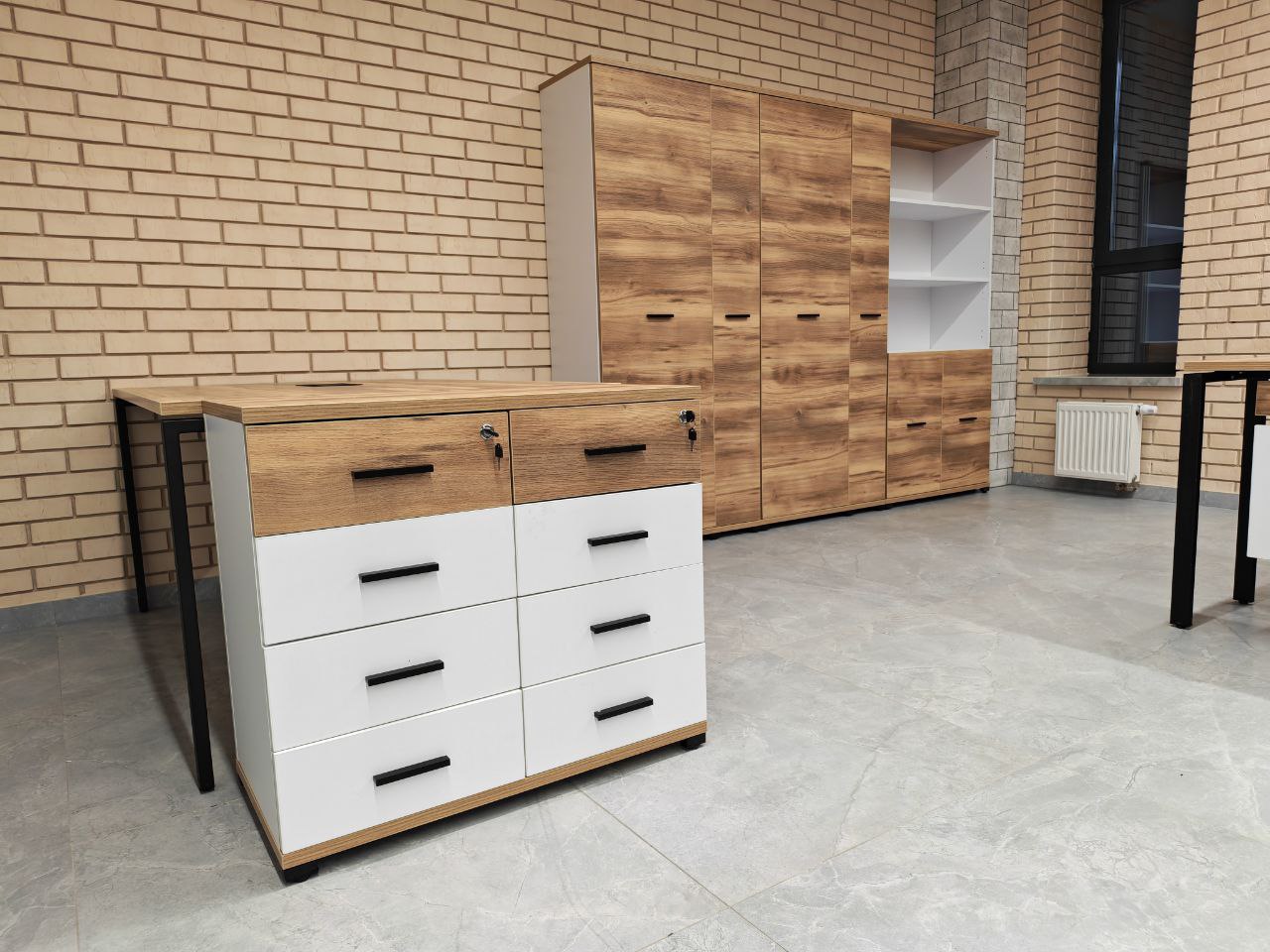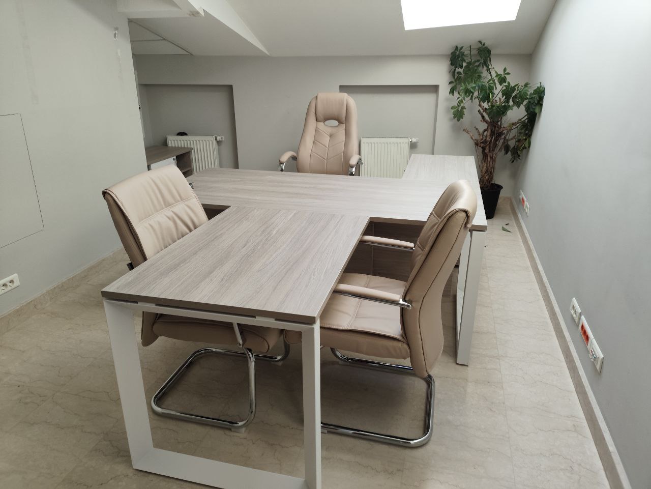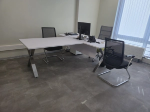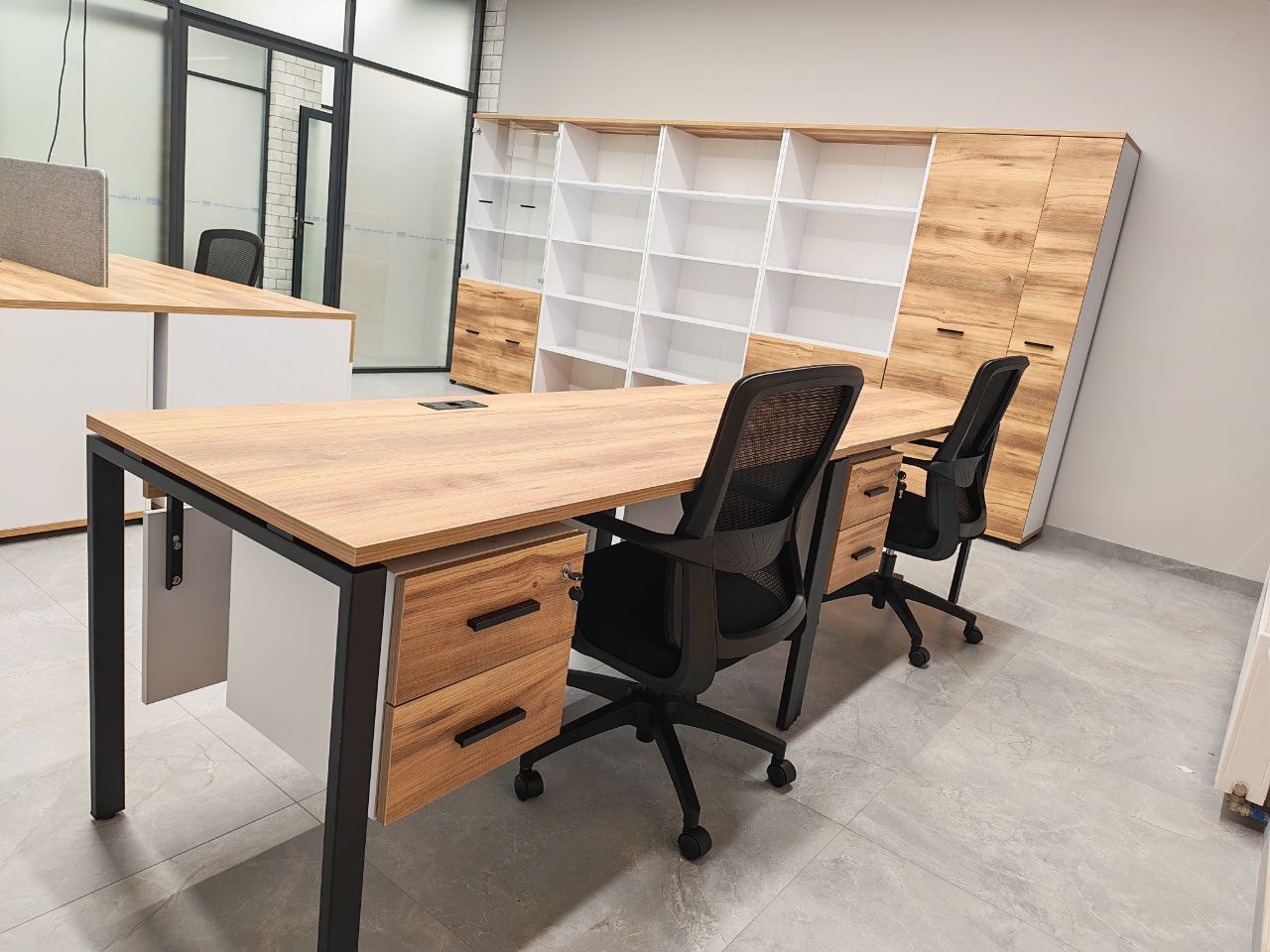 Кабинет руководителя ONIX DIRECT, цвет мебели Дуб Аттик, металлические опоры белая попрошковая окраска. г. Москва