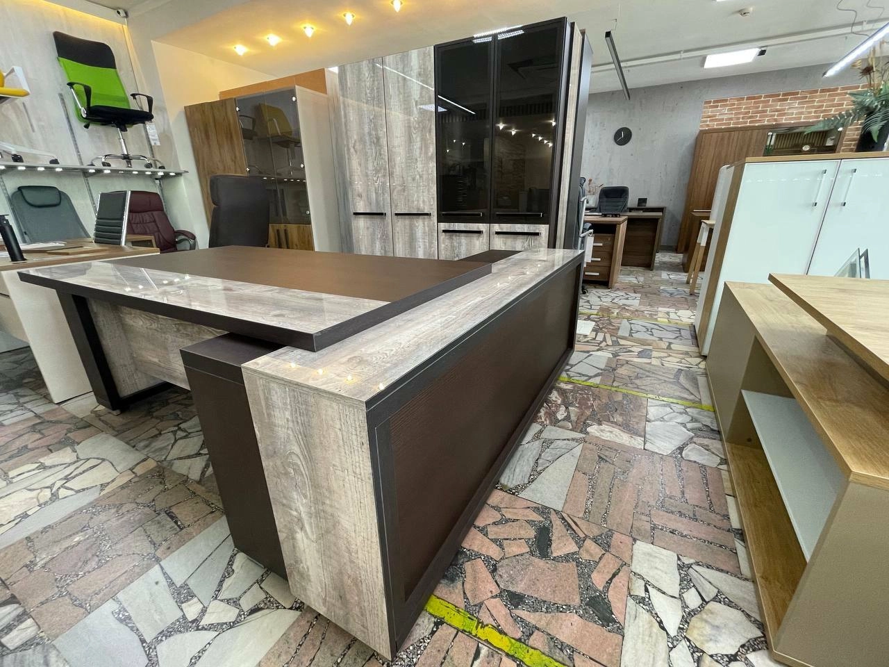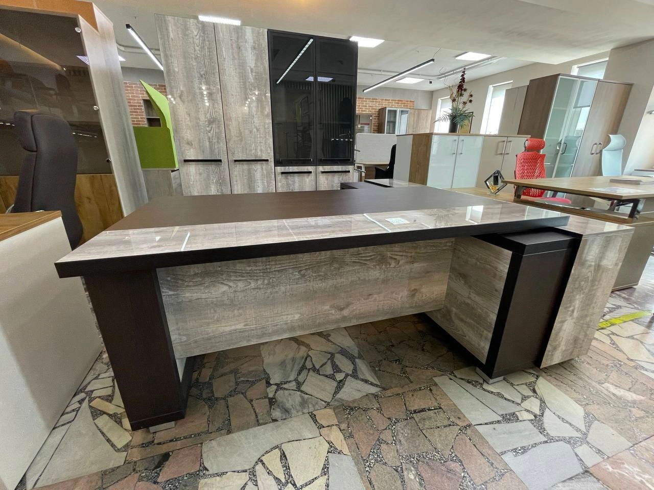 Комплект кабинета GRACE Дуб Линдберг темный - Бетон Пайн (выставочный образец) Стол руководителя c опорной тумбой, гардероб , шкаф закрытый .