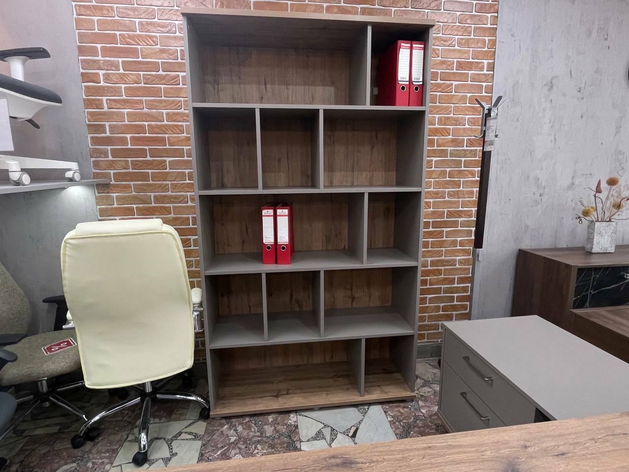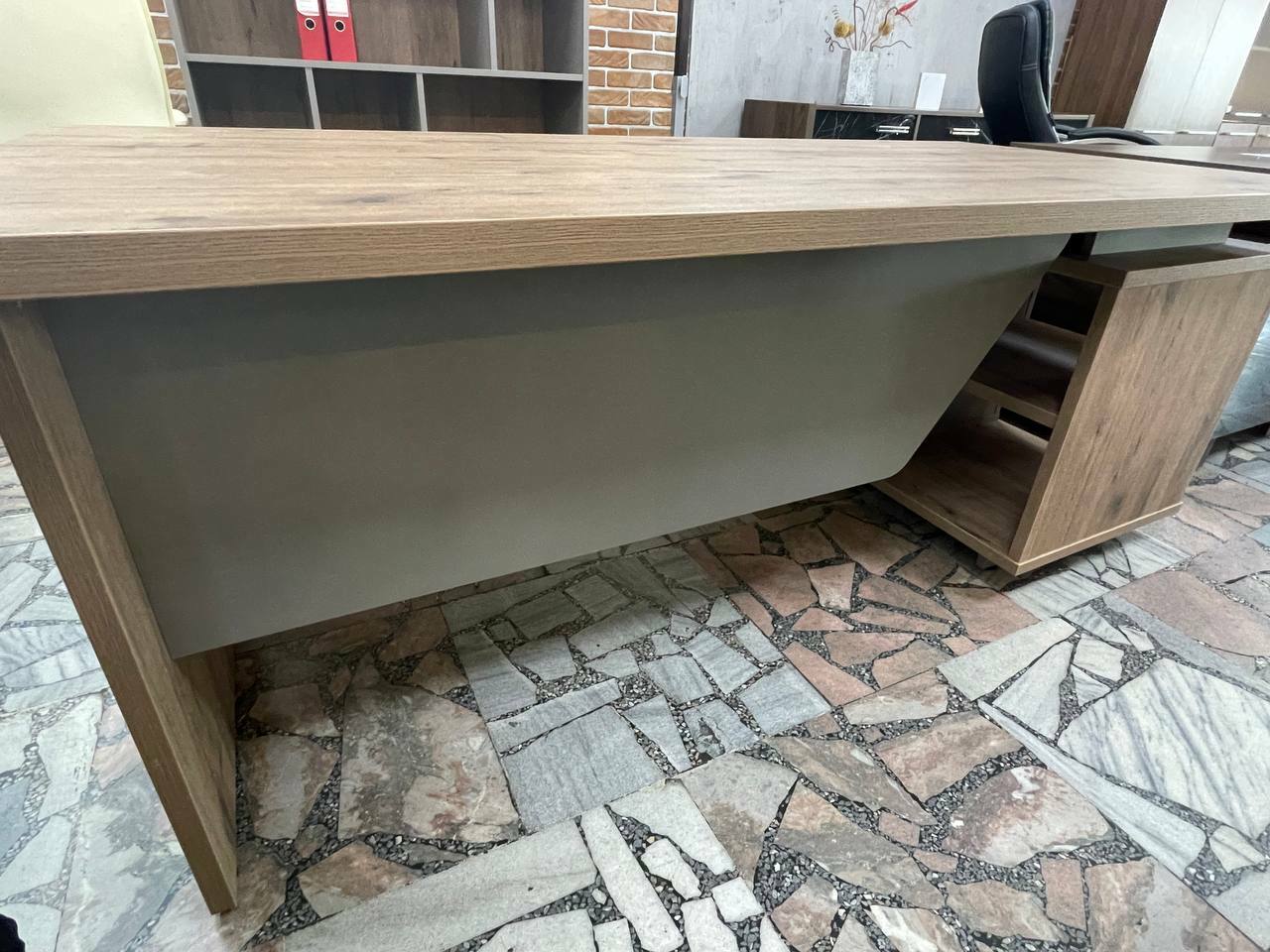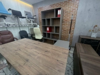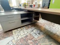 Комплект кабинета VILAS Сосна Касцина - Кубанит серый (выставочный образец) Стол руководителя c опорной тумбой, стеллаж открытый .